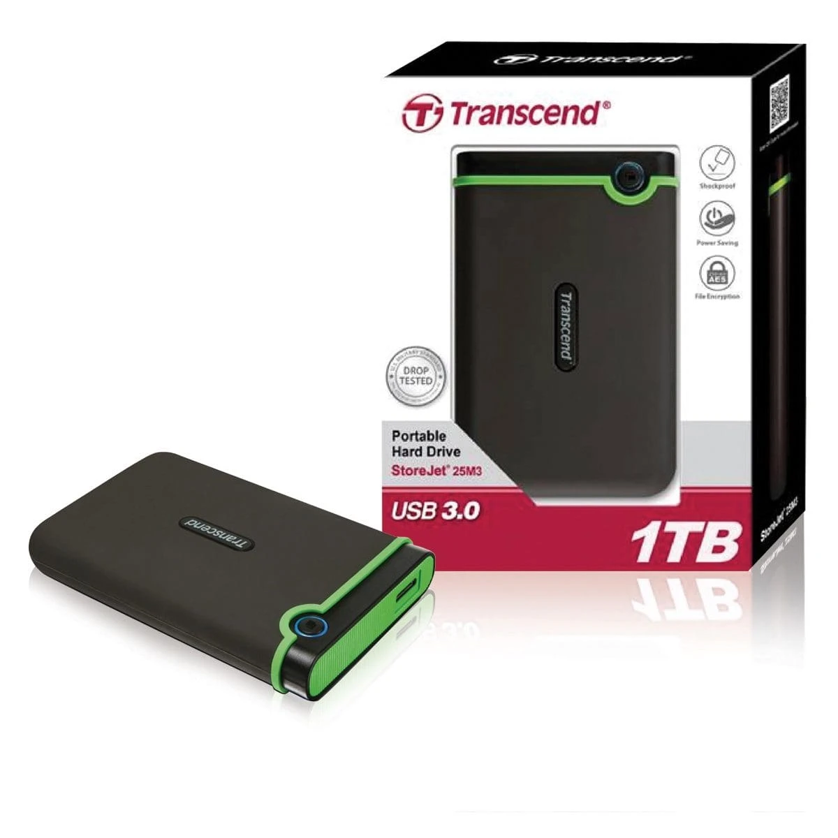 The StoreJet 25M3 portable hard drive is equipped with the next-generation SuperSpeed USB 3.0 interface that provides transfer speeds at least 3X faster than USB 2.0 models. Thanks to the improved bandwidth of USB 3.0, the StoreJet 25M3 makes file sharing easier and quicker than ever with real-world transfer speeds of up to 90MB/s. Military-Grade Shock Resistance Compact, durable and reliable, the StoreJet 25M3 is shielded by an advanced three-stage shock protection system to withstand even the toughest user environment. The outer shell is made of a slip-resistant silicone material, reinforced by a hard casing and an internal hard drive suspension damper all designed to reduce forces of impact and provide maximum shock-absorption.